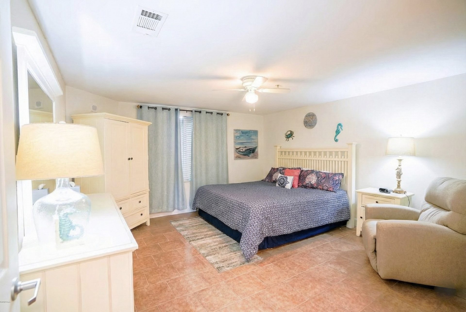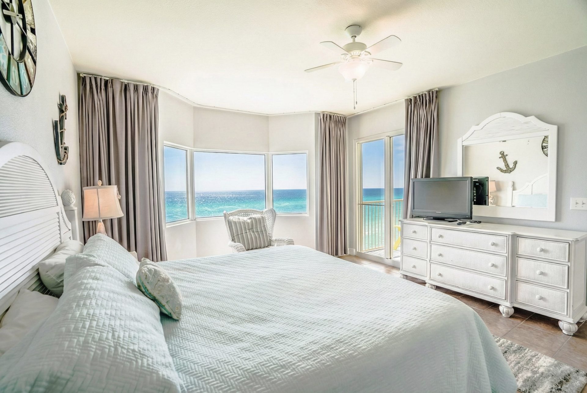 • Master bedroom features: A King Bed, 32″ tv, a private bathroom with a hot tub and shower, topped off by an incredible view of the Gulf and direct access to the balcony.