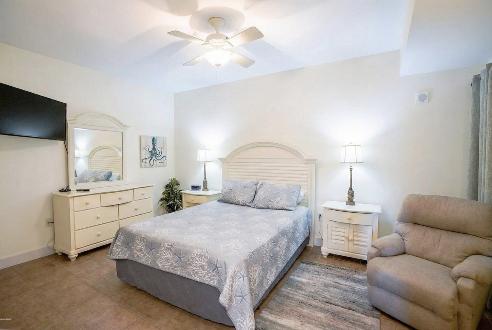 • Third Guest bedroom features a Queen Bed, 40″ television, and access to the third bathroom off the hallway with a tub/shower combo.